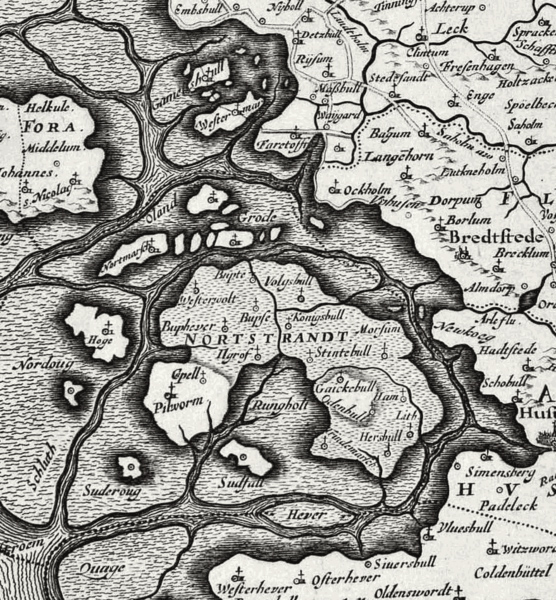 At the start of the little Ice Age, the North sea was hit by a series of storm tides. One of the most infamous was “Das Grote Mandrenke” in 1362 – the great drowner of men. However, not only the changing weather conditions caused the hight floods post 1300. Changing patterns of explotation of the marshy regions along the coastline from Denmark to Holland caused the catastrophies. It began on the 15th of January 1362 but reached its high point on the 16th. This flood caused the destruction of a series of outlying promontories on the Western Coast of Jutland and Friesland all the way down to Holland.